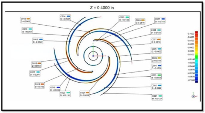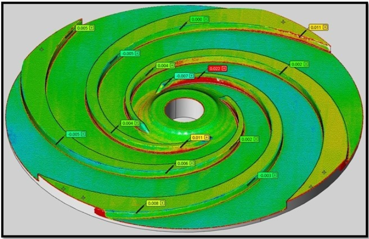 Der Laserscan eines mit keramischen Sandkernen hergestellten Gussteils im Querschnitt zeigt schließlich eine deutliche Verbesserung der Maßhaltigkeit des Gussteils. Die erreichten Toleranzen sind wesentlich enger als bei den ursprünglich verwendeten Kernen auf Quarzsandbasis. Dies zeigt, wie wirksam der Einsatz von Keramiksandkernen bei Anwendungen ist, die eine besonders hohe Maßgenauigkeit und Stabilität erfordern, insbesondere bei komplexen Präzisionsbauteilen wie diesem Laufrad.