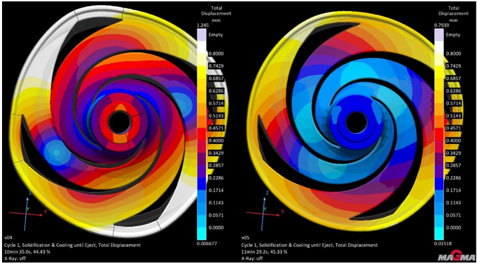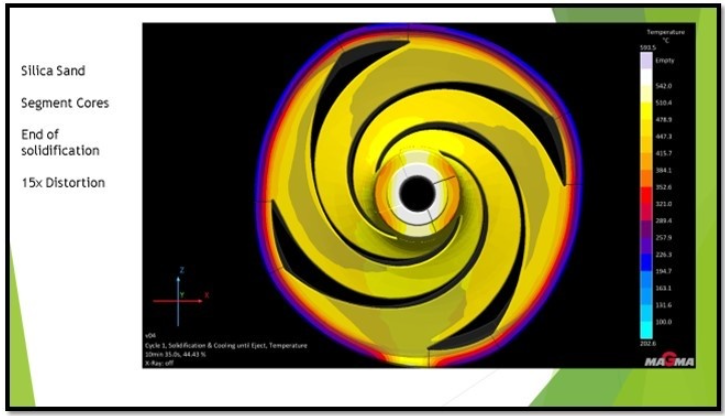 Das Bild unten zeigt die Temperaturergebnisse, einschließlich des vorhergesagten Kernverzugs: Es ist zu erkennen, wie sich die Form des Kerns während des Aufheizens verändert. Bei Raumtemperatur ist der Kern rund, aber wenn er sich erhitzt, führt die thermische Ausdehnung zu einer ungleichmäßigen Verformung. Diese Veränderung macht sich vor allem wegen der Form und der Anzahl der Schaufelschlitze im Laufrad bemerkbar. Dies hat zur Folge, dass der Kern beim Erhitzen eine „eckigere“ Form annimmt, wodurch das Gussteil, wie oben gezeigt, außerhalb der Spezifikation liegt.